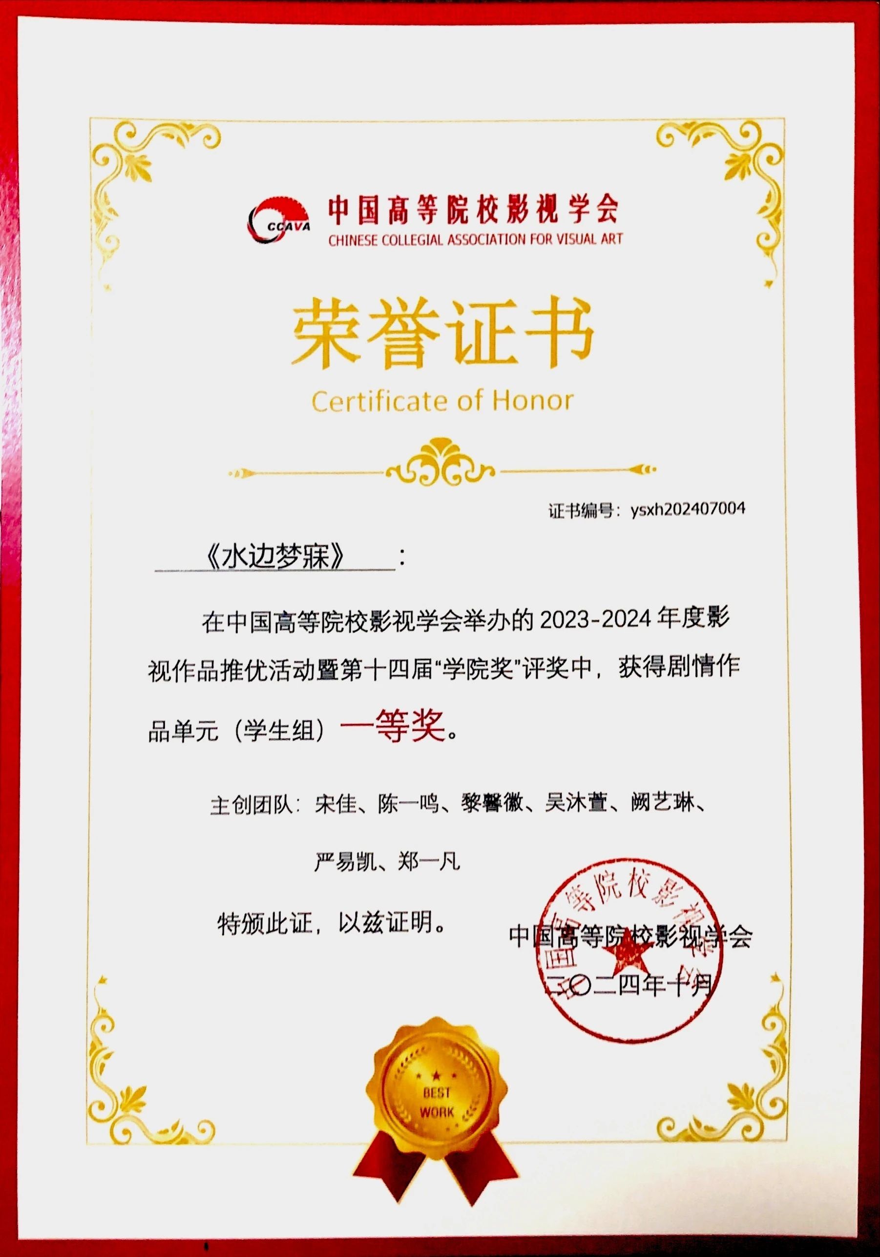 2024年10月26日,中国高等院校影视学会2023-2024年影视作品推优活动暨第十四届“公司奖”颁奖仪式在辽宁大学举行。此次影视作品推优活动的终评阶段,共有307部作品入围,其中剧情单元竞争尤为激烈,汇聚了来自北京电影公司、中国传媒大学等多所知名高校的优秀作品,共计68部。在这场高手如云的角逐中,由太阳城娱乐新闻与传播系邱察老师精心指导的员工团队——宋佳、黎馨徽、陈一鸣、吴沐萱、阙艺琳、严易凯、郑一凡,凭借其精心制作的剧情片《水边梦寐》大放异彩,成功斩获全国一等奖。此次一等奖在全国范围内仅评选出5个名额,而公司作品占据其中一席,这充分彰显了公司员工的卓越创作才能与不屈不挠的拼搏精神。