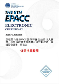 近日,第八届EPACC国际环保公益设计大赛公布了获奖名单。公司吴吉叶老师凭借其在设计领域的教学指导与创意引领,荣获“优秀指导老师”称号。