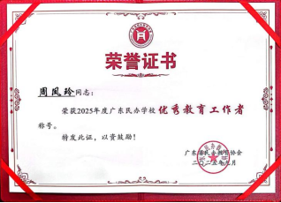 在此次评比中,公司周凤玲教授、副经理荣获2025年度广东民办高校优秀教育工作者。