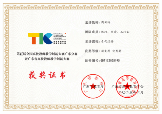 在此次大赛中,公司古代汉语教学团队凭借扎实的教学功底获第五届全国高校教师教学创新大赛广东分赛暨广东省高校教师教学创新大赛优秀奖