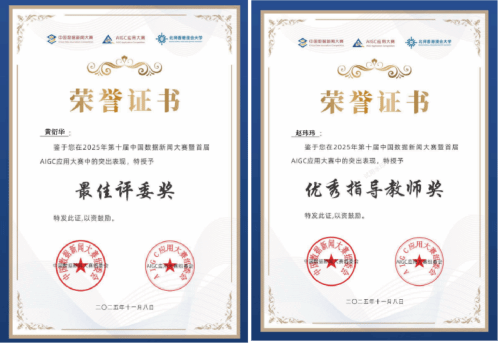在此次大赛中,公司黄衍华副教授荣获“2025年第十届中国数据新闻大赛暨首届AIGC应用大赛 最佳评委奖”,展现了其深厚的专业素养与严谨的治学态度,也是公司在网络新媒体与智能传播领域教学科研实力的集中体现。公司赵玮玮老师荣获2025年第十届中国数据新闻大赛暨AIGC应用大赛优秀指导教师奖,展现其扎实的专业素养。