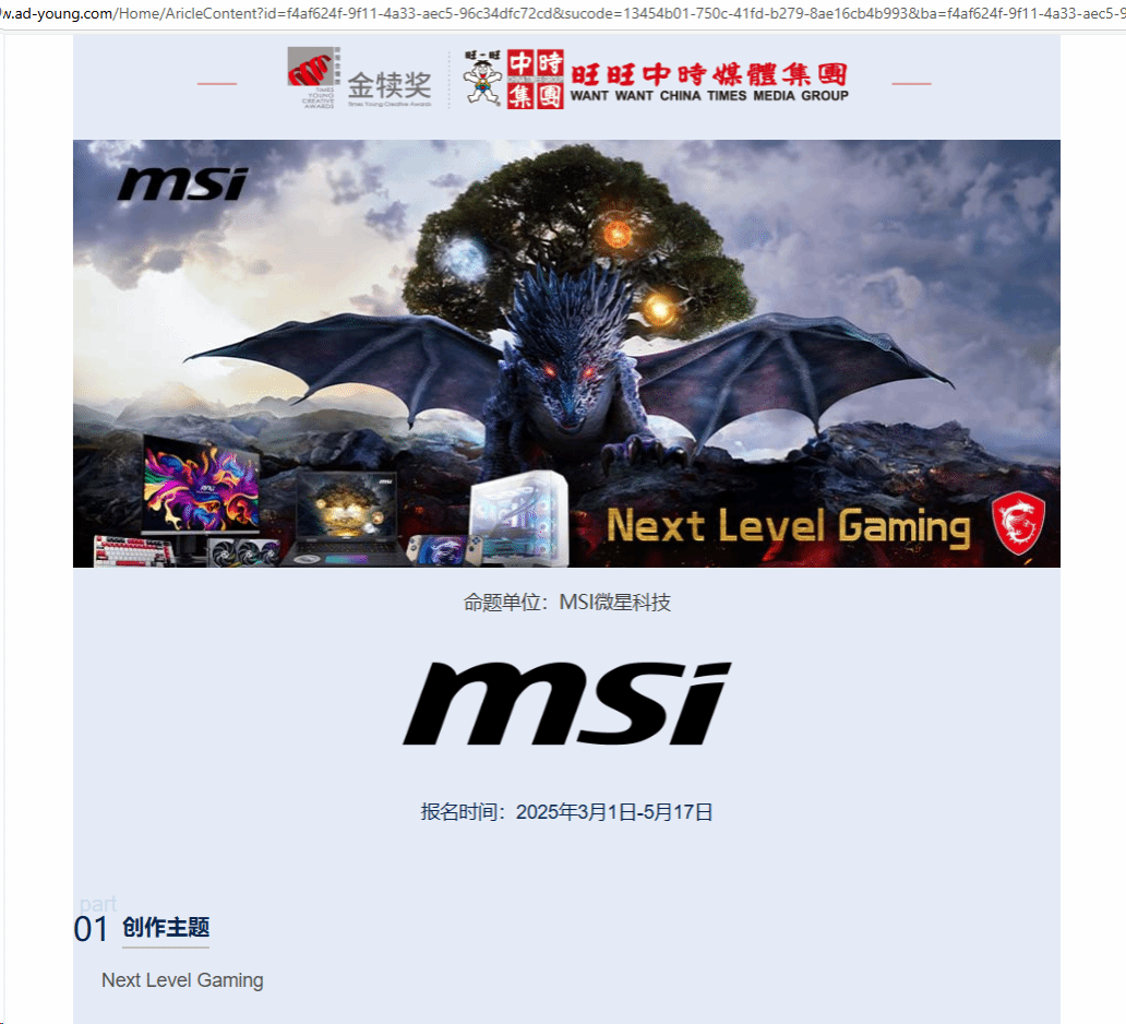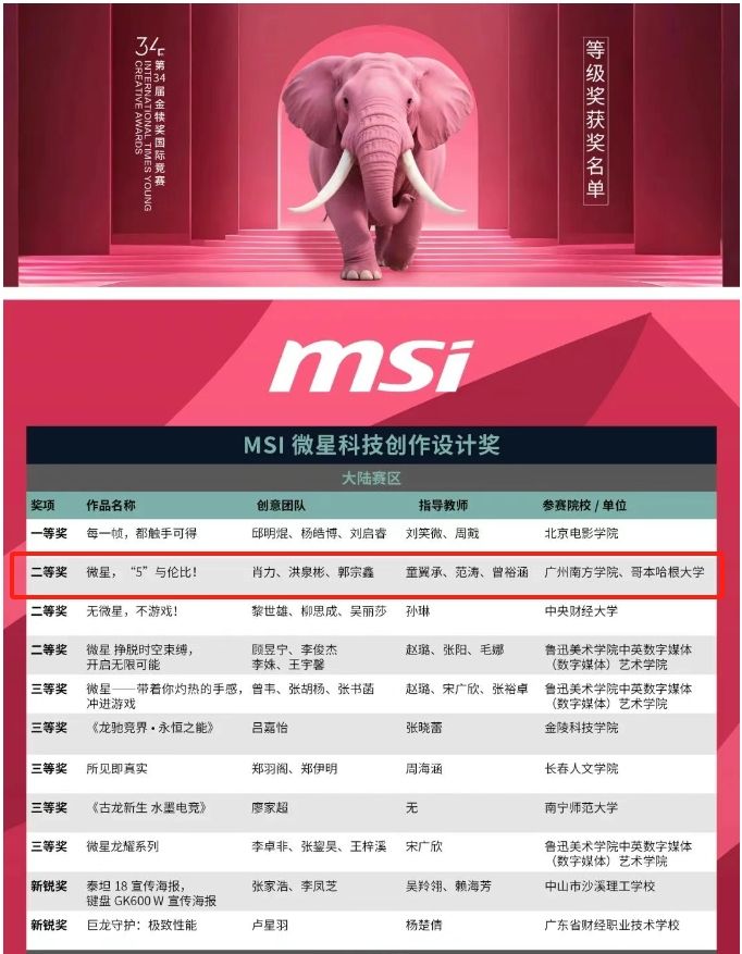 在“第34届金犊奖国际竞赛”中,公司网络与新媒体系童翼承老师指导员工团队(肖力、洪泉彬)的作品《微星,“5”与伦比!》获得MSI微星科技创作设计奖国家级二等奖。