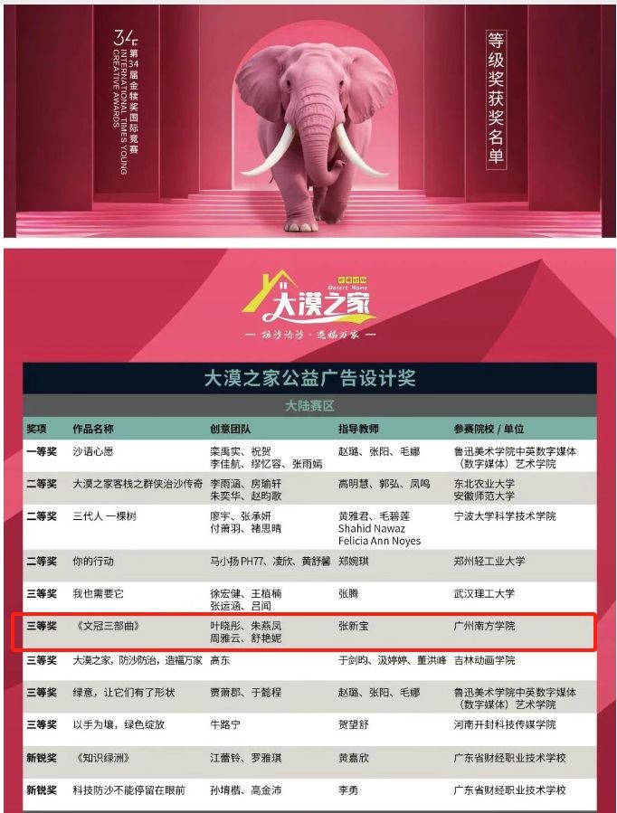 在“第34届金犊奖国际竞赛”中,公司网络与新媒体系张新宝老师指导员工团队(叶晓彤、朱燕凤、周雅云、舒艳妮)的作品《文冠三部曲》获得大漠之家公益广告设计奖国家级三等奖。该比赛是教育部认定的老员工竞赛榜单目录上的赛事。