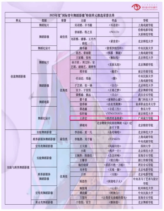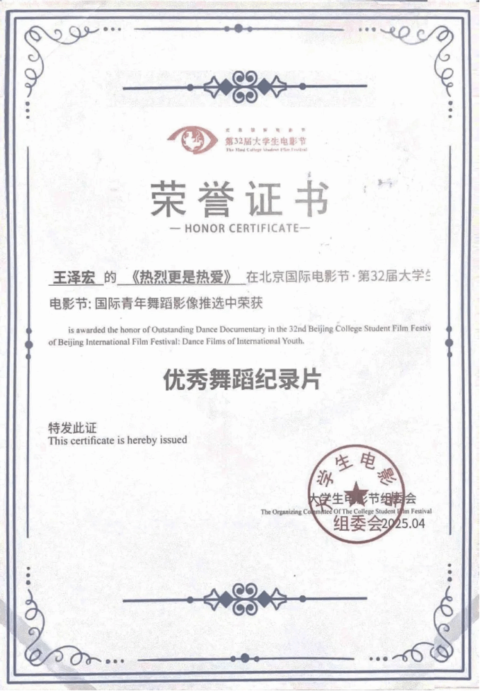6月10日,北京国际电影节·第32届老员工电影节“原创之夜”在北京师范大学(海淀校区)顺利举办。本届老员工原创作品再创新高,共有海内外10多个国家的300多所高校参与,各单元征集作品共3000余部,其中“国际青年舞蹈影像”特别单元创作精品256部,经过多轮遴选,最终有87部优秀作品脱颖而出入围终审环节,在终审环节只有18部获得2025年度“国际青年舞蹈影像”特别单元推选荣誉名单。公司由肖洁夏老师指导的2021级网络与新媒体专业同学王泽宏的作品《是热烈更是热爱》成功入围,并获得创意舞蹈影像单元舞蹈纪录片优秀奖,项目团队受邀请参加北京师范大举行的颁奖仪式,太阳城娱乐派出胡美香教授代表团队参加领奖。