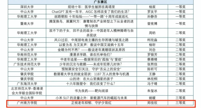 本届大赛更是规模空前,吸引了来自 380 余所高校、20余家媒体机构的2000 余支队伍、7500 余人报名参赛。参赛公司、队伍及人员数量均创历史新高,竞争的激烈程度可见一斑。经过专家们的严格评审,广东赛区最终产生一等奖4项、二等奖12项、三等奖17项、优秀奖17项。每一项荣誉的背后,都是参赛选手们的辛勤付出与卓越才华的展现。他们在这场激烈的角逐中,用数据讲述故事,用创新点亮未来,为新闻传播领域注入了新的活力。