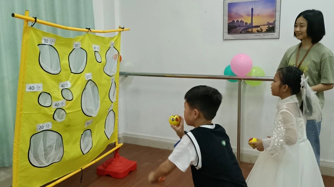 “咚!”又一个球成功投入球网中,小朋友们站在离自己一米五处的起点欢呼,他们全神贯注地瞄准目标,用力掷出球,希望能够一击命中。