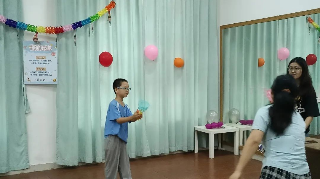 小朋友与家长分别站在两端,当一方用力抛出球时,另一方则全神贯注地紧盯着球的飞行轨迹,他们时而弯腰俯身,时而侧身移动,全身心投入到这场紧张刺激的游戏中。