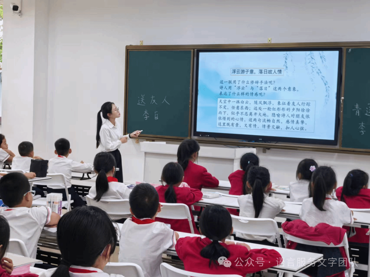 课堂伊始,小张老师带着同学们学习了诗人李白的简介,简单了解诗歌背景。《送友人》是唐代诗人李白创作的一首充满诗情画意的送别诗,为李白名篇之一,全诗表达了作者送别友人时的依依不舍之情与离情别绪之意。“知诗人,诵诗歌”的学习环节在同学们的朗朗读书声中结束了。