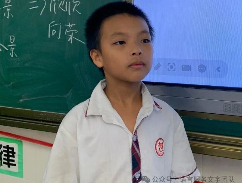 随后,小杨老师提问道:“同学们,你们在上阕中能找到几种声音?”同学们踊跃举手,积极参与到课堂互动中来。诗人苏轼在诗词中,充分运用视听结合,一句一景的写作手法,营造出了农民安居乐业,乡村欣欣向荣的浓郁氛围。