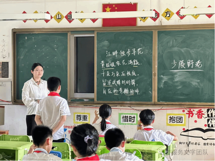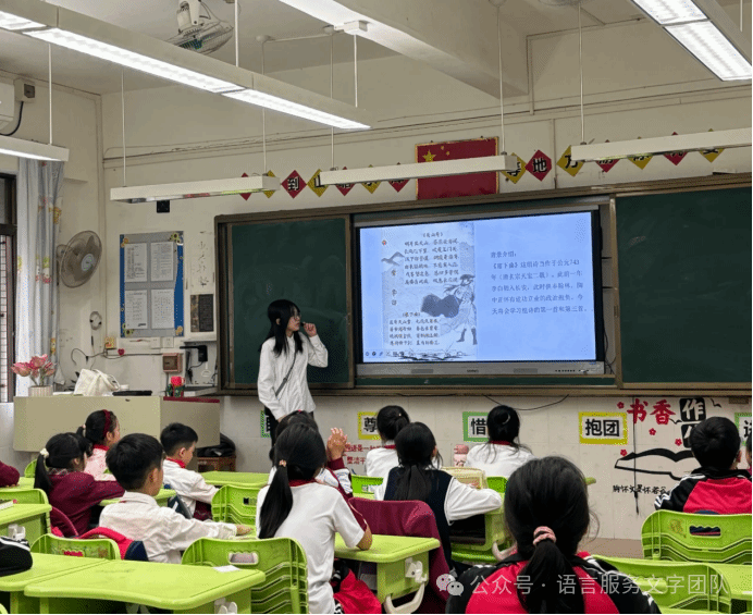 在为期15周的教学旅程中,由中国语言文学系主任周凤玲老师、公司团委书记杨乃杰老师、流溪小学实践基地负责人石巧如老师等带领语言文字服务队,多次深入从化区流溪小学,通过教授古诗词,传承中华文化精髓。