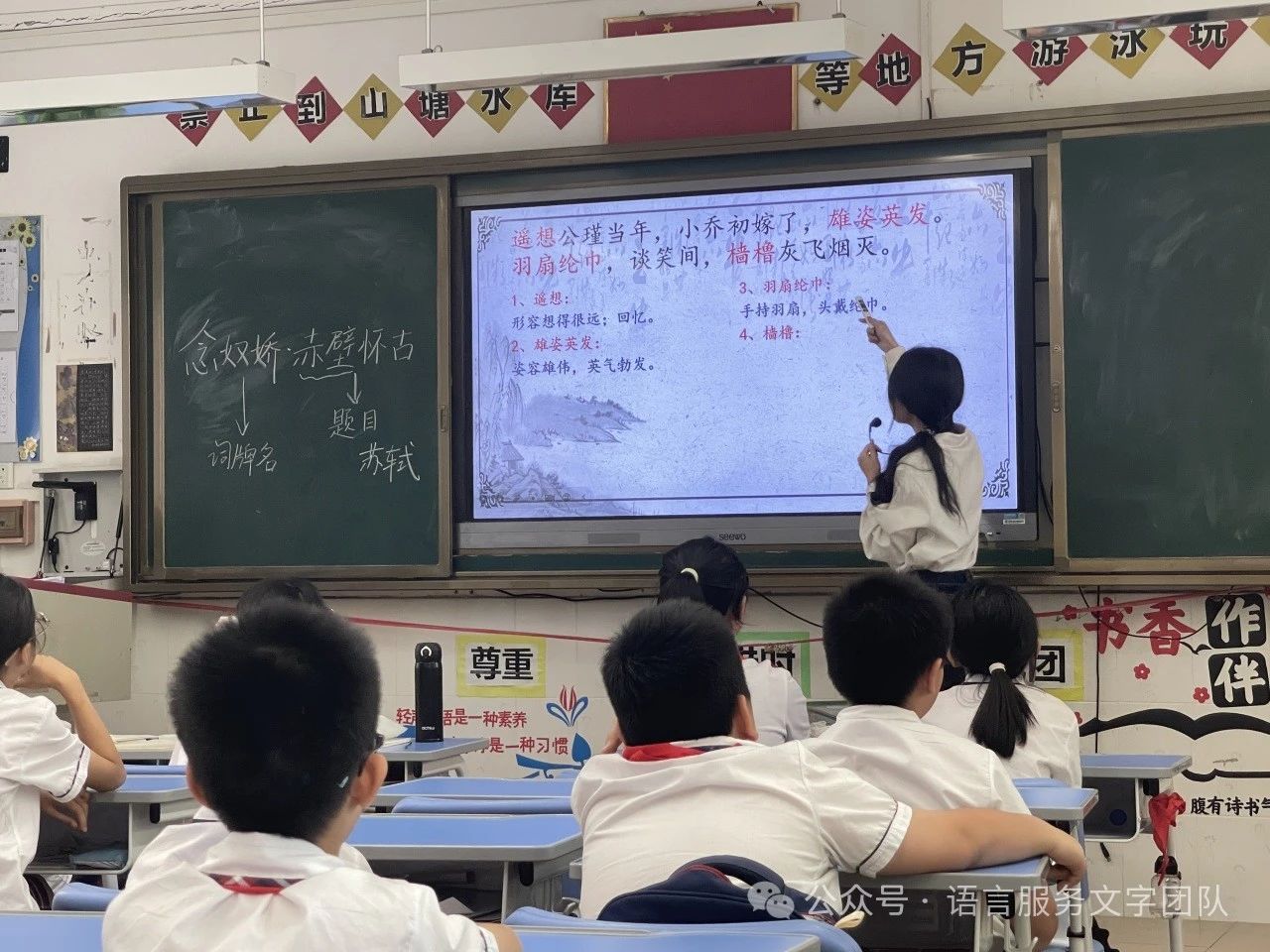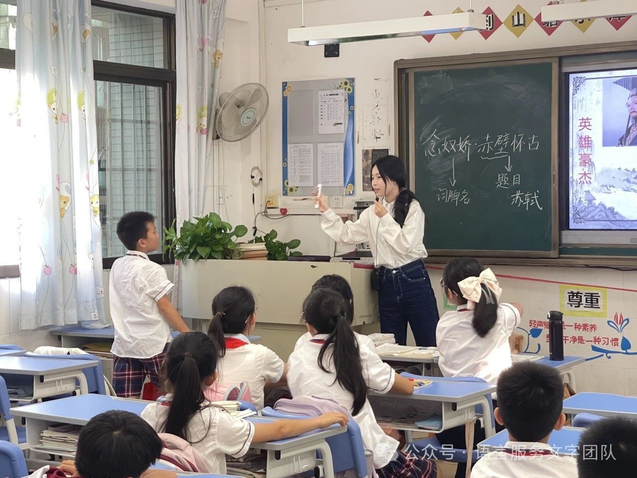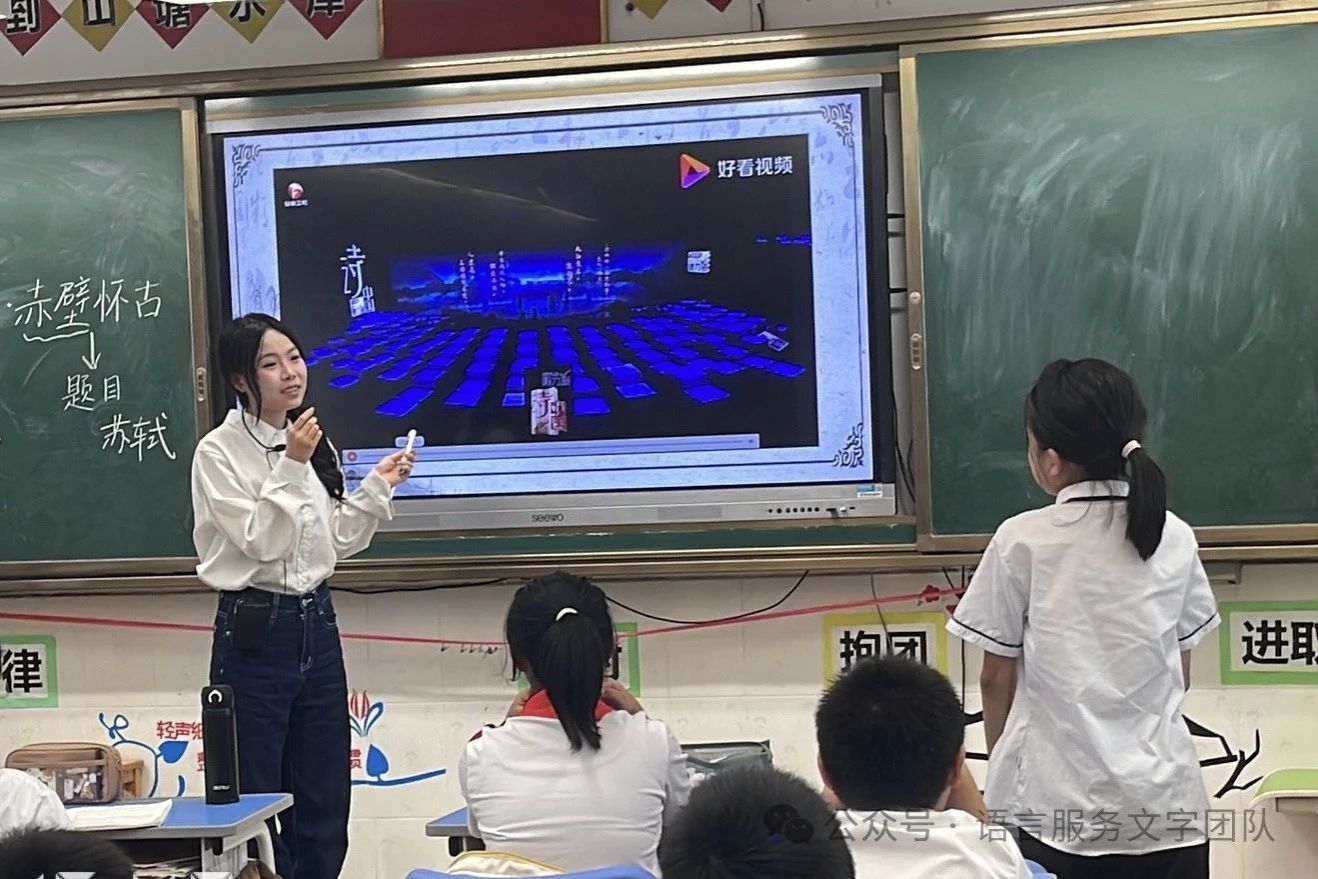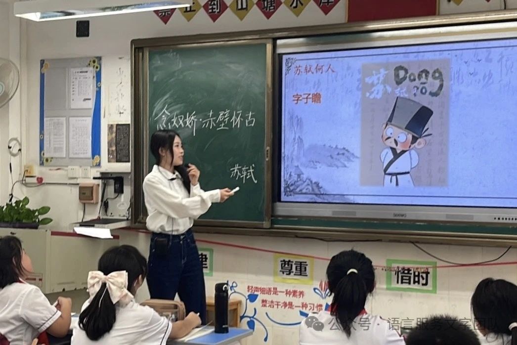立于江水之边,看着滚滚东去的长江之水,往往会引起人们的思考。今天,就让我们一起走近苏轼的意境空间,一起品读《念奴娇·赤壁怀古》。《念奴娇·赤壁怀古》是宋代文学家苏轼的词作,是豪放词的代表作之一,曾被誉为“古今绝唱”。苏轼的一生都在经历仕途的坎坷,但他困顿人生的诗意值得我们品味。9月30日,太阳城娱乐语言文字服务团队的同学们在石巧如老师的带领下,来到从化区流溪小学,开展了一节韵味无穷的古诗词课堂。