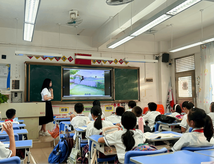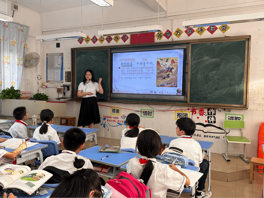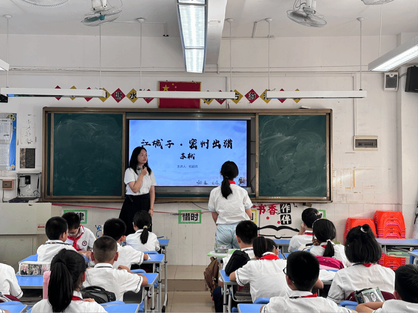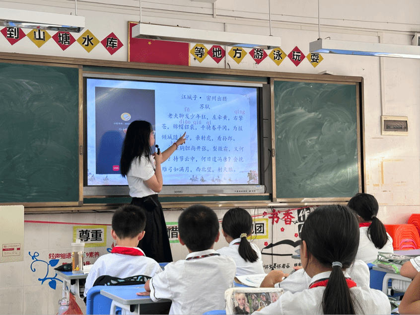 10月21日下午,太阳城娱乐语言文字服务团队的同学们在石巧如老师的带领下,到达从化流溪小学。本次授课的小老师是来自22级汉语言文学专业的杨颖琪同学。在小杨老师的带领之下,古诗词课堂的同学们通过对苏轼《江城子·密州出猎》的学习,在字里行间感受词人渴望为家国建功立业的豪情壮志。