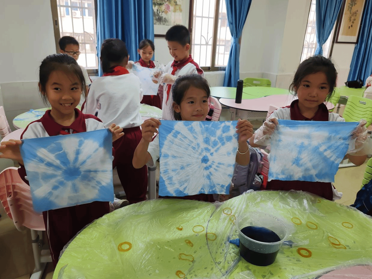 临近下课,同学们兴高采烈地拿着自己的作品相互交流和欣赏。通过这次体验扎染的课堂,他们对于非遗之美有了更深地体验与感悟。每一次扎染,都是不期而遇的惊喜。每一次展开,都是独一无二的画面。透过那一条条蓝白相交的布,我们不仅感受到无与伦比的艺术美感,同时也领略到古人的智慧和古老技艺的力量。匠人精神在每一块布上沉淀,我们应继续走在奋斗的路上,继承和发扬非遗文化,让非遗之花绽放大地。