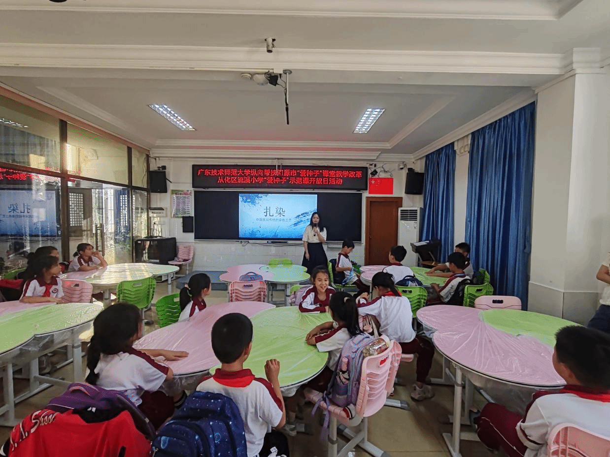 随后,为了加深同学们对扎染的了解和激发他们对扎染的兴趣,小杨老师向同学们播放了一段有关扎染的视频。随着视频的放映,同学们的热情逐渐高涨,纷纷期待起待会的扎染实践活动。
