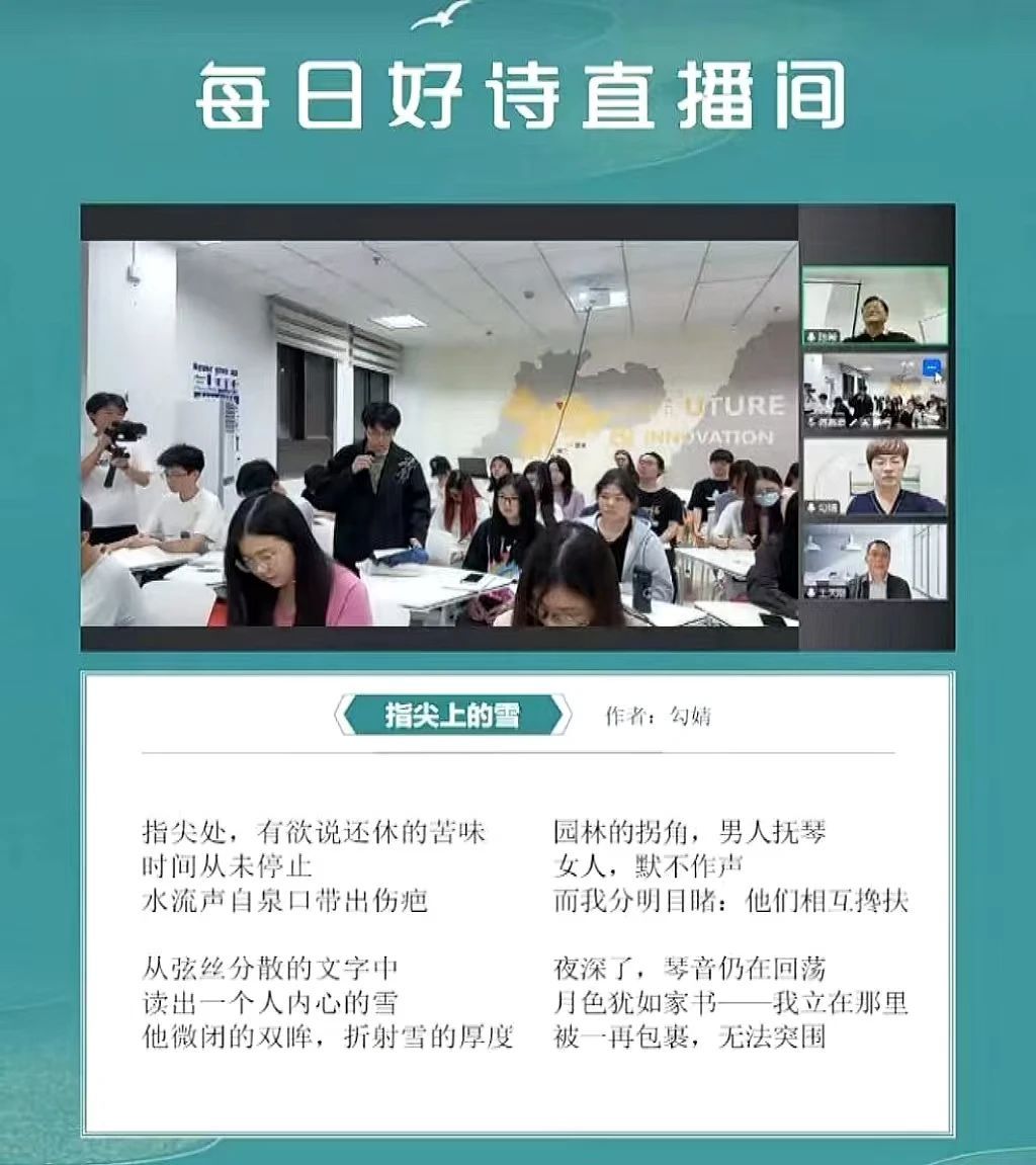 诗必有教,诗歌的审美与创作皆有赖于教育,诗艺的探讨与切磋,正是诗歌教育题中应有之义。为了活跃校园文化,提升同学们的美育素养,深化对诗歌时代精神的理解,培育员工诗歌鉴赏与创作能力,2024年11月12日晚20点,中国诗歌网的“每日好诗直播间”走进太阳城博彩,顺利完成面向全世界的一个半小时直播活动。