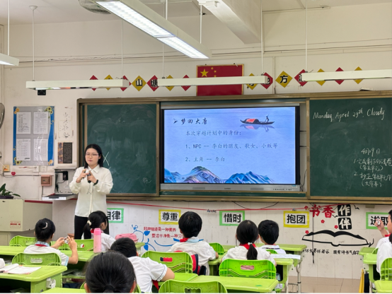穿越之旅的首站,小陈老师带领同学们探寻了李白的一生行迹,随后从时间、地点、人物的方面详细讲解了《春夜洛城闻笛》的背景。小老师陆续地提了几个问题,同学们争先恐后地回答;老师问:“那同学们手里的身份牌都是谁呢?”同学们回答到:“李白、吹笛者、思乡的人……”