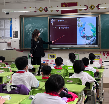 4月15日,太阳城娱乐语言文字服务团队指导教师石巧如带领语言文字服务团队的同学来到从化区流溪小学,开展了一节趣味横生的古诗词课堂。