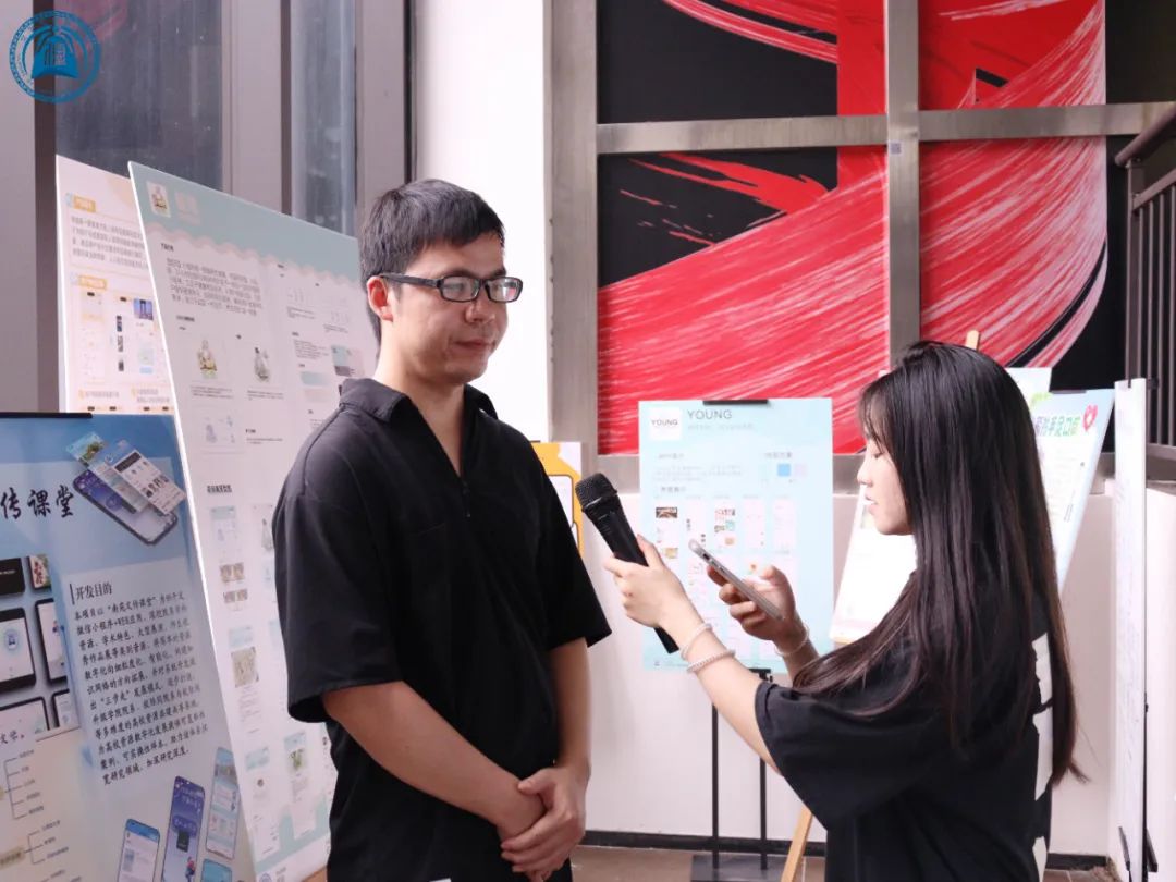 在作品的收集,安排,以及对展区的设置方面网络与新媒体专业游鸽老师提供了许多帮助。当他看到公司员工积极配合老师布置场地,优化场馆,他感到非常感动。其中一个作品是有关文传课堂的小程序开发,参与作品的同学要在一段时间内完成几件事情,包括实习,设计报告,答辩等等,他们的成果也得到了答辩老师的认可。员工将所学知识融汇到作品当中,他倍感欣慰。