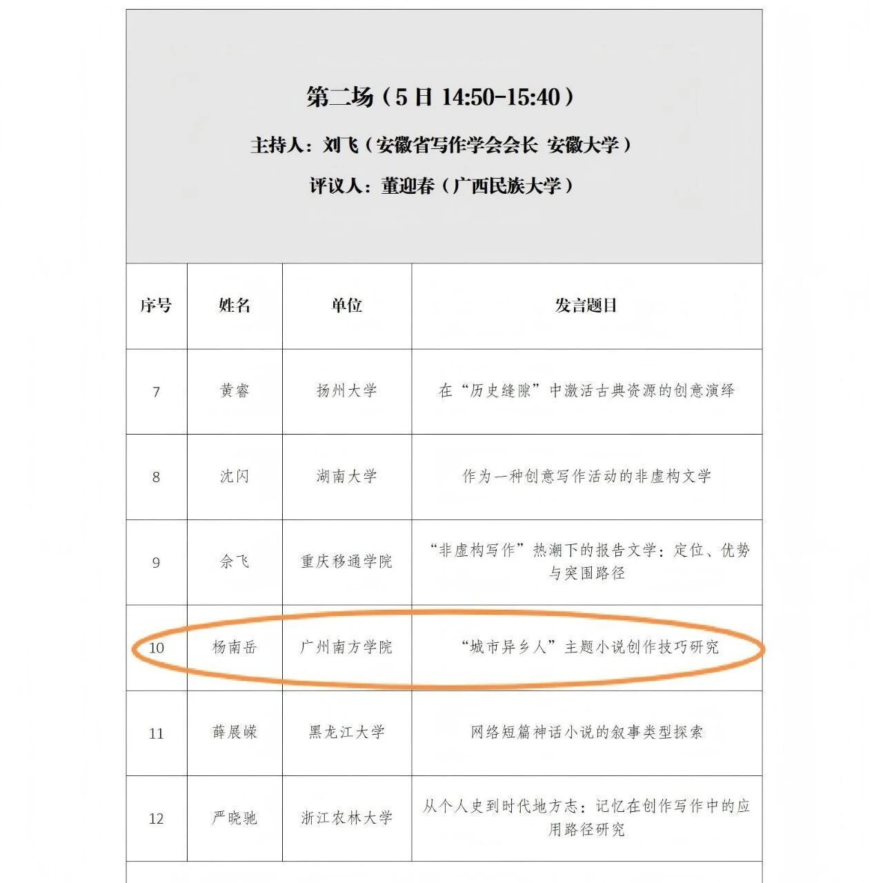 杨南岳老师在第三论坛“经典作家作品创意阅读与创意写作研究”第二场发言。该场主持人为安徽省写作学会会长、安徽大学刘飞,评议人为广西民族大学董迎春教授。杨南岳老师的论文题目为《“城市异乡人”主题小说创作技巧研究》,从黑格尔的美学视角出发,借助荣格的集体无意识理念,探究城市异乡人书写的当代可能性。通过对城市异乡人经典文本的分析,发掘中外异乡人本质的不同。