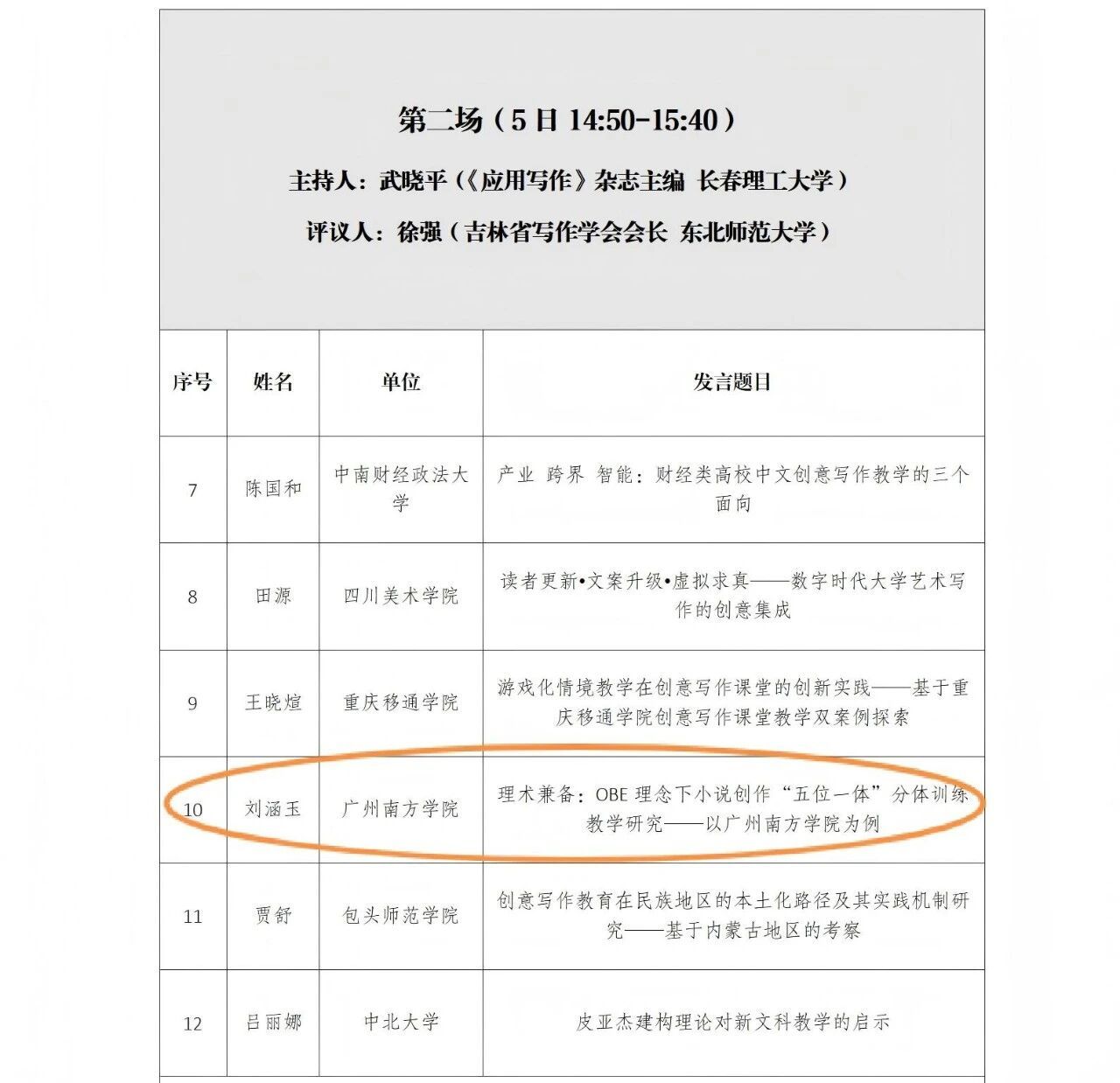 刘涵玉老师在第二论坛“中文创意写作公司产品改革研究”第二场发言。该场主持人为《应用写作》杂志主编、长春理工大学武晓平,评议人为吉林省写作学会会长、东北师范大学徐强教授。刘涵玉老师的论文题目为《理术兼备:OBE理念下小说创作"五位一体"分体训练教学研究——以太阳城博彩为例》,以《小说叙事研究与创作实践》这一课程为例,分析该课程如何基于“OBE”教学理念,以“理术兼备”策略重构小说创作课堂教学内容,构设五位一体教学模式,针对性地解决五大教学困境。