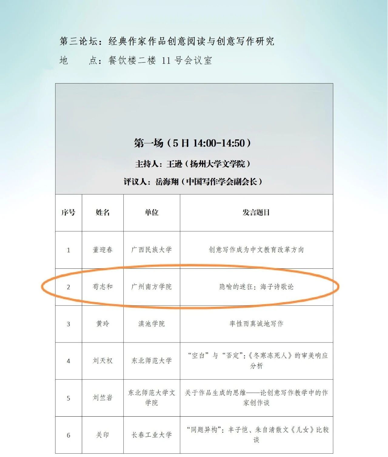 苟志和老师在第三论坛“经典作家作品创意阅读与创意写作研究”第一场发言。该场主持人为扬州大学文公司王逊,评议人为中国写作学会副会长岳海翔。苟志和老师的论文题目为《隐喻的迷狂:海子诗歌论》,从隐喻这一海子诗中的关键方法来理解他的诗,理解他的死亡,从而也理解诗歌与生命的关系。
