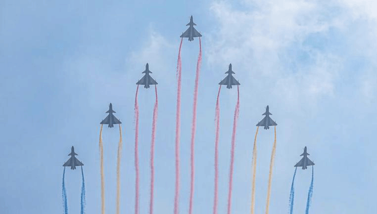 空中梯队如雄鹰展翅,呼啸着划过天际。战机编队以精准的飞行动作和完美的队形变换,在空中绘就了一幅幅壮丽的画卷,展示了中国空军的强大实力和卓越风采。