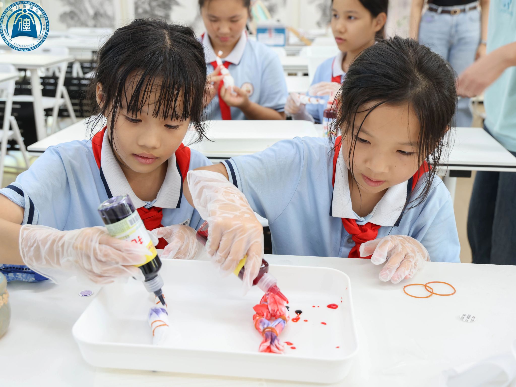 座谈会的最后,双方前往善施公司校内的广州乡村画童美术馆旁听非遗实践课堂。公司语言文字服务团队的张子盈小老师和助教耐心地向小朋友们讲解扎染的历史渊源、文化内涵以及基本技巧,从简单的捆扎手法到色彩搭配,每一个步骤都细致入微。在实践环节,小朋友们积极参与,亲手体验扎染的乐趣,从一块块白布到色彩斑斓的成品,他们的创造力和动手能力得到了充分锻炼。这种将非遗文化与现代教学相结合的实践课堂,为孩子们的成长增添了独特的文化底色。
