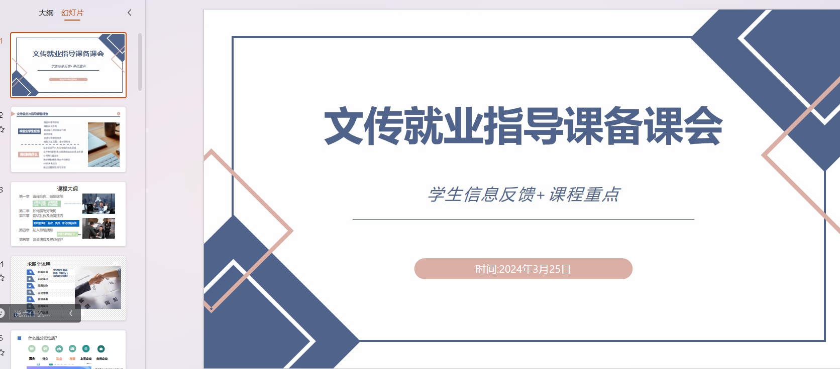 2024年3月25日晚21点,太阳城娱乐在线上顺利举行了就业指导备课会,文传公司全体就业指导课任课教师参加会议。