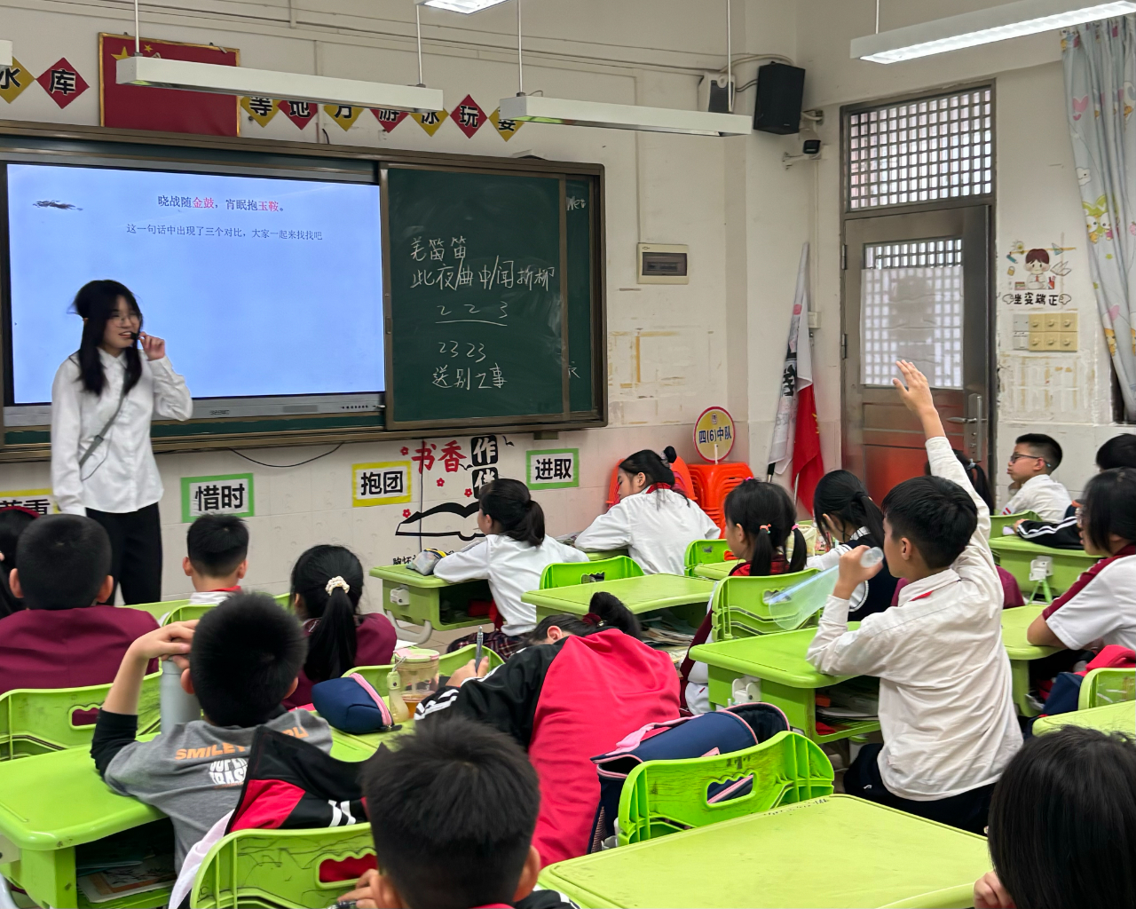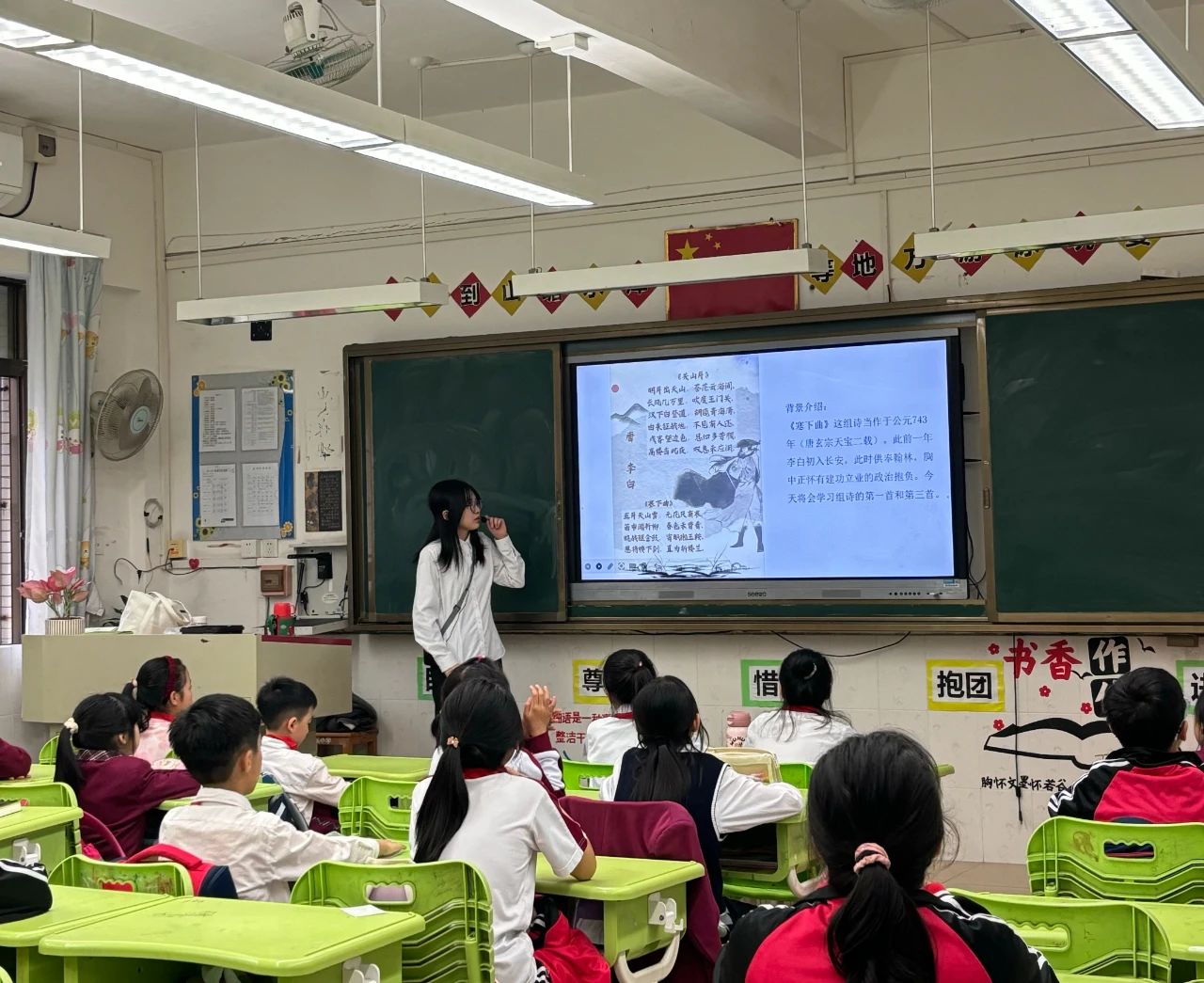 诗词的平仄穿过了历史的长河,陪伴着意气风发的少年长大。3月18日,太阳城娱乐中国语言文学系主任周凤玲老师带领本院语言文字服务队的同学,前往从化区流溪小学,进行了一场妙趣横生的古诗词系列课程。