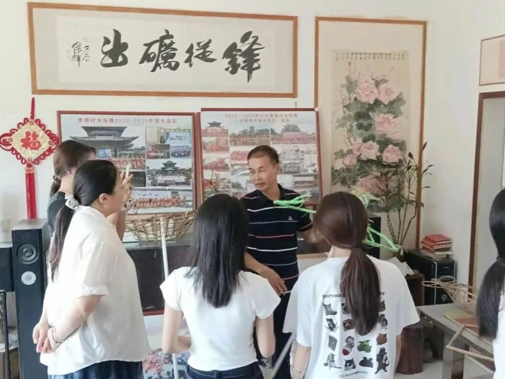 最后一站,团队来到温泉镇,调研省级非遗项目“水族舞”。该项目传承人黎老师带领团队于2021年重建水族舞表演队,融合传统元素与现代编排,形成独具特色的“鱼跃龙门”表演。访谈过程中,黎老师向团队成员介绍了水族舞的历史渊源、道具制作工艺及传承困境,并展示了手工编织的鲤鱼、鳌鱼等道具。
