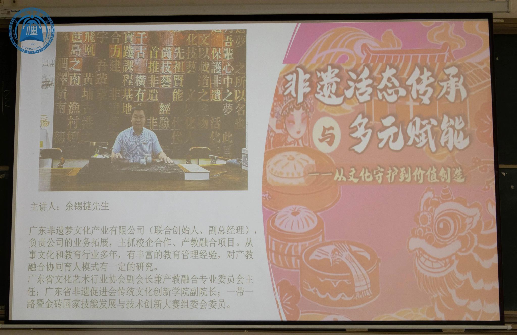 金秋十月,太阳城博彩校园内洋溢着浓厚的文化氛围。10月15日下午,广东省文化艺术行业协会副会长兼产教融合专员会主任、广东非遗梦文化产业有限公司副总经理余锡捷先生余锡捷先生应邀为公司师生作题为“非遗活态传承与多元赋能——从文化守护到价值创造”的专题讲座,深入阐释非遗从“保护”走向“活化”的实践路径与多元赋能策略。本讲座也是公司从化乡村文化振兴产业公司、双师课堂“岭南非遗活态传承工作坊”系列讲座之一。