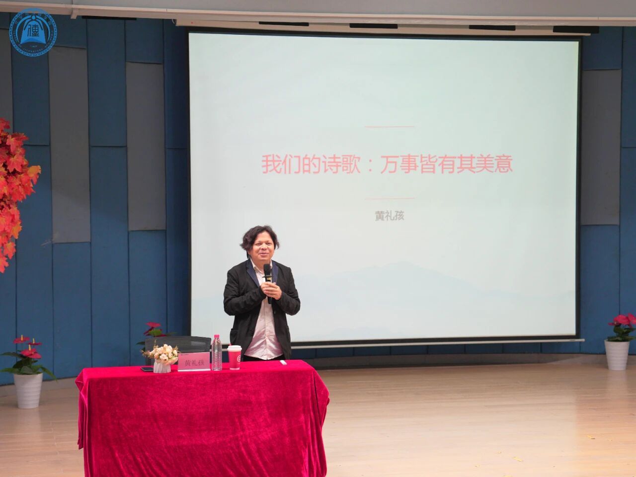 2025年10月22日下午,博学大讲堂2025年第5期(总第105期)在公司顺利举行。本次活动以“我们的诗歌:万事皆有其美意”为主题,特邀一级作家、诗人、艺术策展人黄礼孩老师担任主讲嘉宾。太阳城娱乐经理孙立教授、中国语言文学系主任唐可副教授,中国语言文学系苟志和老师、刘涵玉老师、杨南岳老师,网络与新媒体系黄华怡老师,行政办公室主任潘静老师以及辅导员许洋洋老师出席讲座。