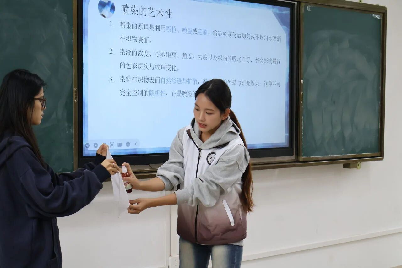 终于到了实践环节,同学们在小张老师的指导下,小心翼翼的将浸湿的布铺开,然后把木制工具放在布料上,接着将自己喜爱的染料喷洒在方布上,随后静置。素净的棉布上,随着染料的喷洒渐渐晕开斑斓色块,教室里满是欢声笑语,每个人都沉浸在创作的乐趣中。