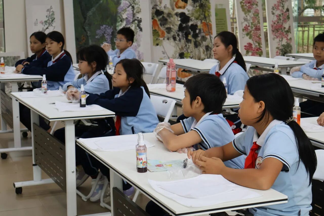 几方白布,几瓶颜料,在孩子们的巧手下焕发出别样的生机。课堂结尾,孩子们高高举起自己的作品,脸上洋溢着自豪的笑容,对着镜头留下这充满意义的瞬间。