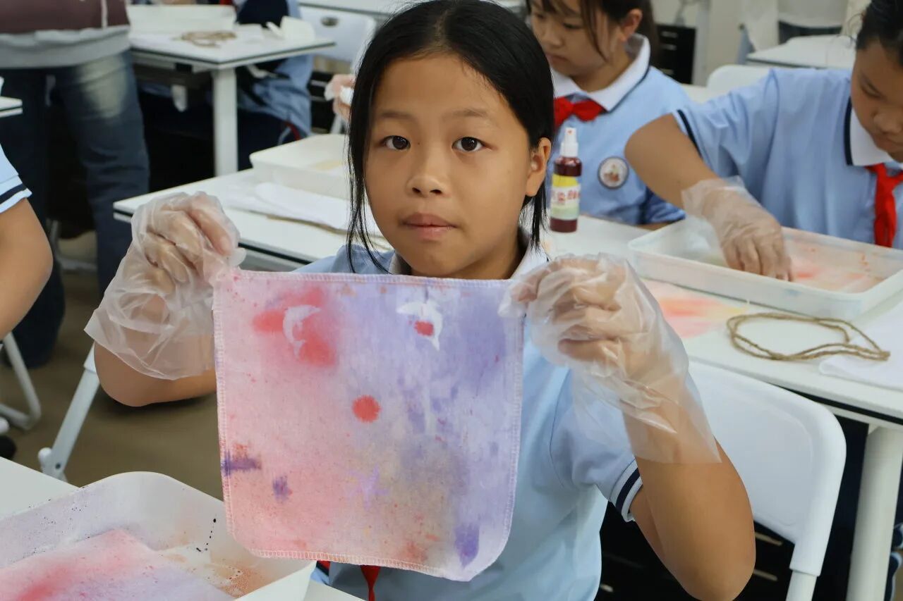 这不单单是一场趣味手工课,更是一场沉浸式的文化之旅。非遗的种子,早已随着一折一扎、一喷一染的巧思,悄悄在孩子们心中扎根,我们坚信,这份对传统之美的感知与记忆,会如同布料上的蓝韵般隽永,在时光里慢慢生长,终有一天绽放出满目的文化繁花。