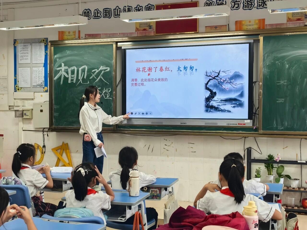 课堂伊始,小龙老师先带同学们认读字词、讲解朗读技巧,再引领大家齐声诵读,让大家在朗朗书声中,初步触摸词里的悲戚基调。带着这份初感,同学们紧跟小龙老师的思路深入赏析:老师通过拆解字词的方式,逐一对“春红”、“太匆匆”、“朝来寒雨”等词句解读,同学们全神贯注、沉醉其中,仿佛真的走进李煜的心境,体会到他那时的苦楚与牵挂。