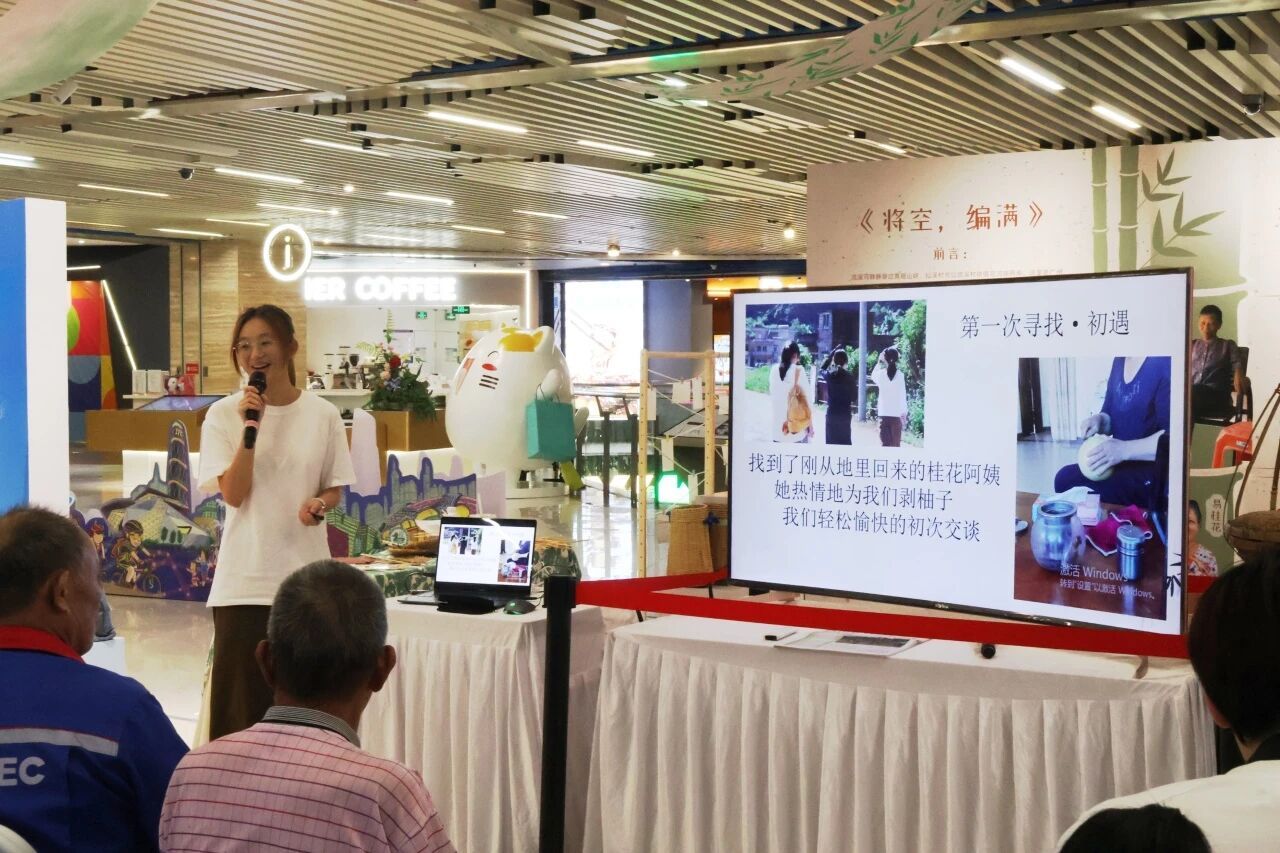 活动开始,“小传统故事”指导老师钟依琼带领观众参观展览,介绍了团队调研的初衷,并分享了五位老人的故事。接着,员工代表韩汝枫和王淑婧讲述两次下乡的所见所感以及与老人们相处的温情瞬间。未能到达现场的员工汪淦也特意写了一封信,由同学在现场念出,表达了对村民的感恩之情。