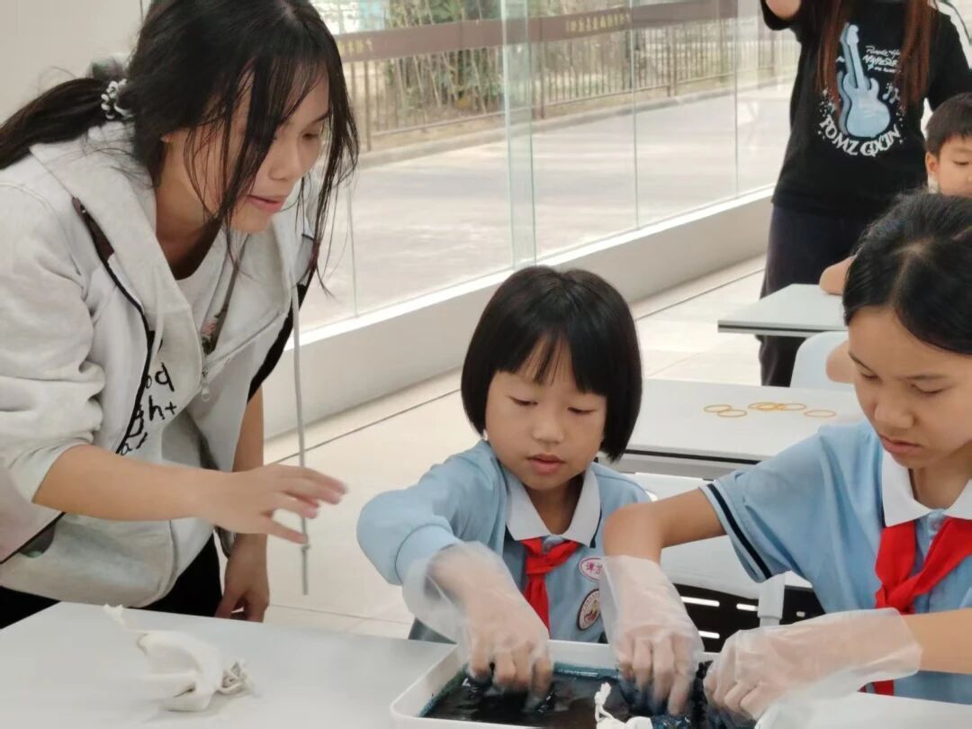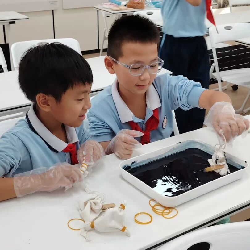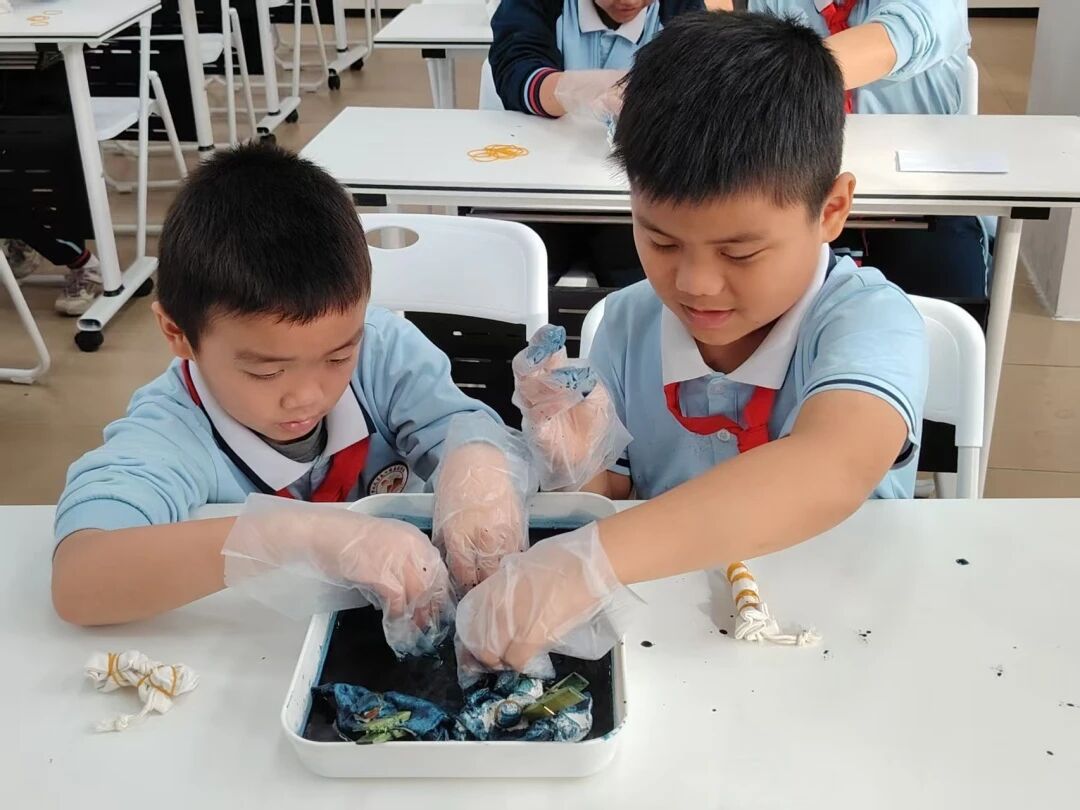 随着时间的推移,布料逐渐染上了鲜艳的色彩,而那些被捆绑的部分则因为染料无法渗透,保留了原本的颜色,形成了独特的图案。同学们迫不及待地拆开皮筋。当图案绽放的瞬间,雪花和漩涡正手拉手跳舞,当布料从染缸中取出,解开那些缠绕的线绳,一幅绚丽多彩的画卷便在眼前徐徐展开,每一次解开都是一次惊喜的揭晓。