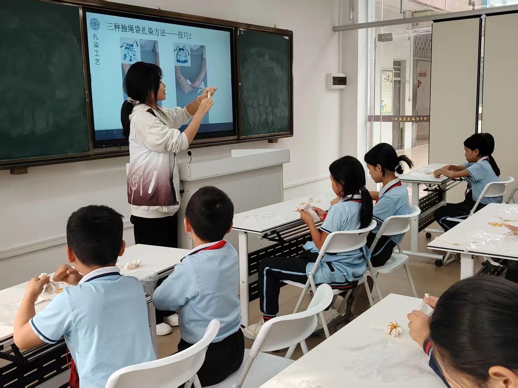 紧接着,小庄老师询问大家:“有哪位同学知道扎染图案是如何形成的?”一听到这个问题,同学们立马欢呼雀跃起来,纷纷举起手来,课堂中充满了喜悦温馨。