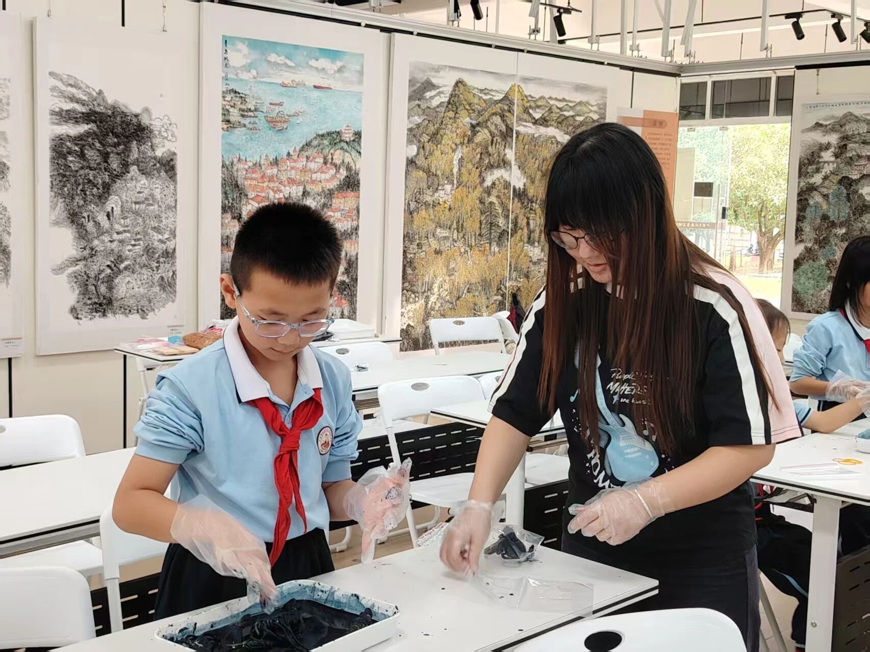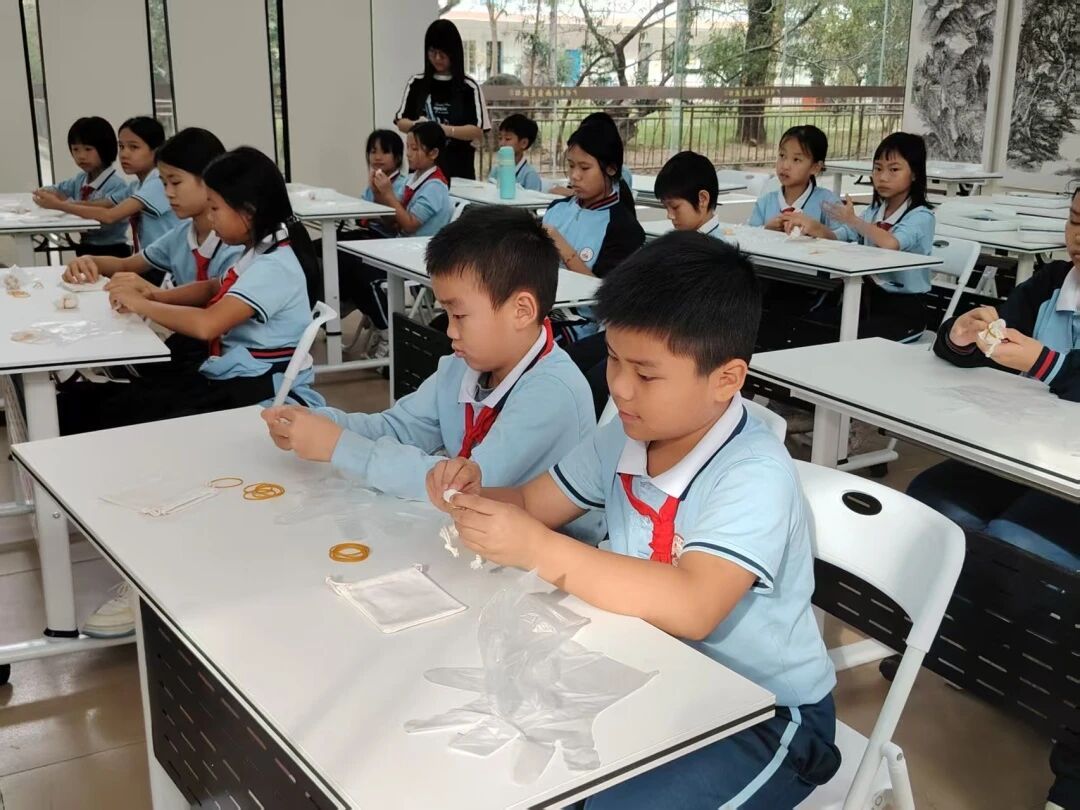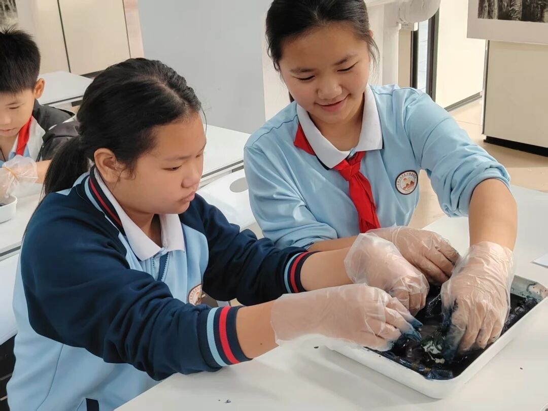 同学们早已摩拳擦掌、跃跃欲试,终于来到了激动人心的实践环节,大家有序地带好手套拿起抽绳袋,准备开启自己的扎染制作之旅。