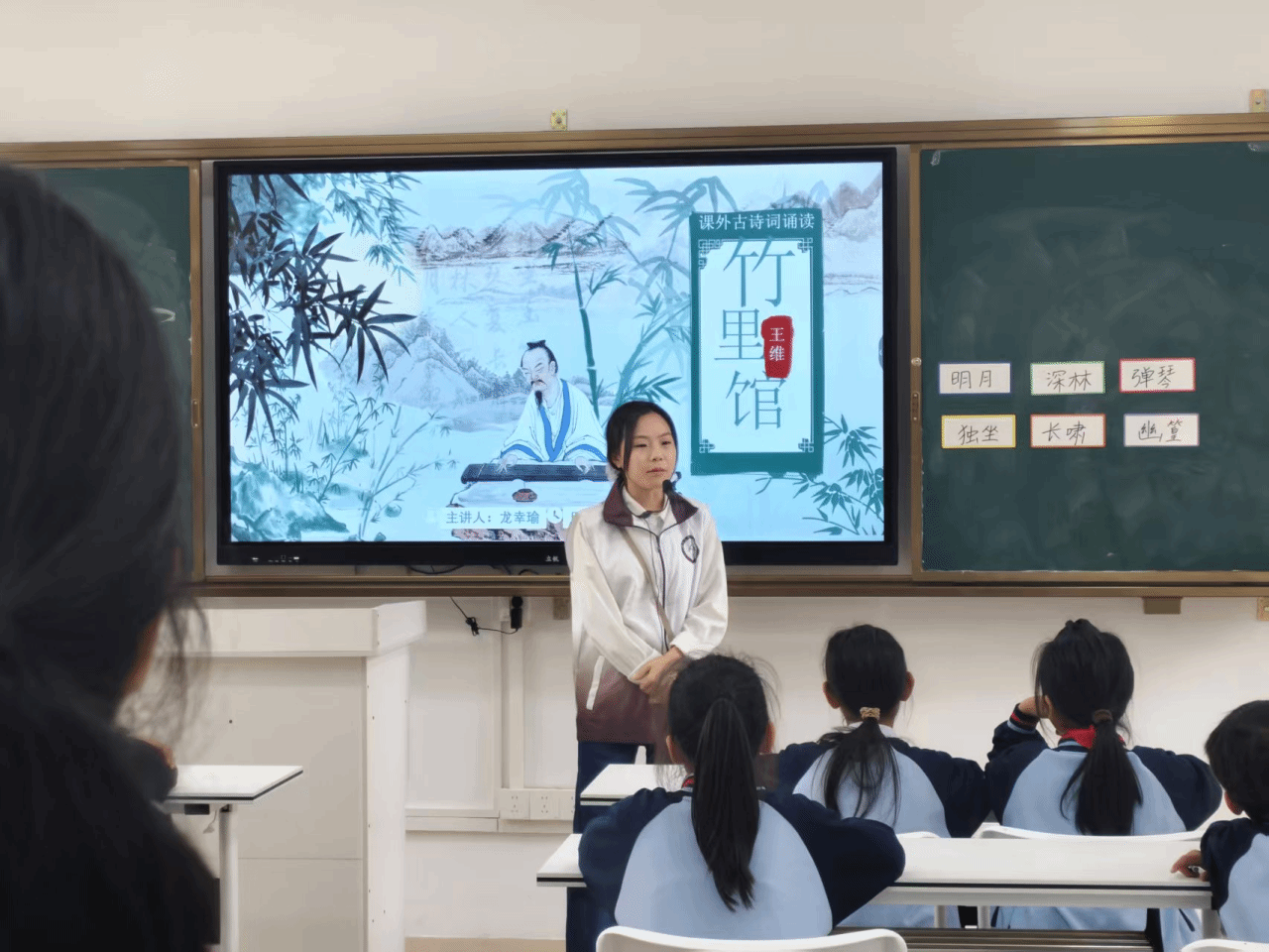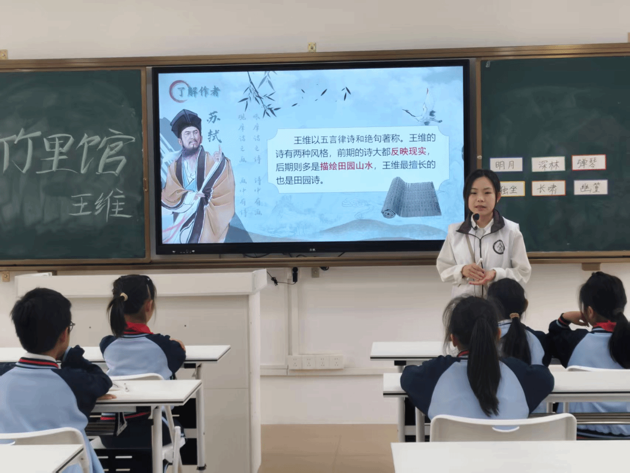 这堂课里小朋友们不仅感受到了王维在竹林里的孤独,更深刻体会到“诗中有画”的高超境界。课堂在最后一遍朗读中落下帷幕。