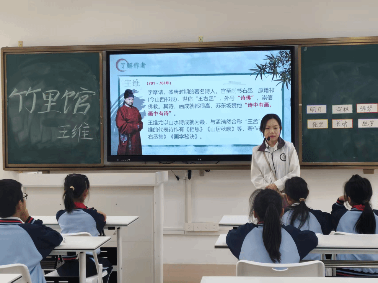 课堂伊始,小龙老师向小朋友们提问对王维的了解,小朋友们充满激情地说“王维是诗佛!”小龙老师把握住课堂的节奏,引出今天的主题“品诗中画,悟隐者心”。