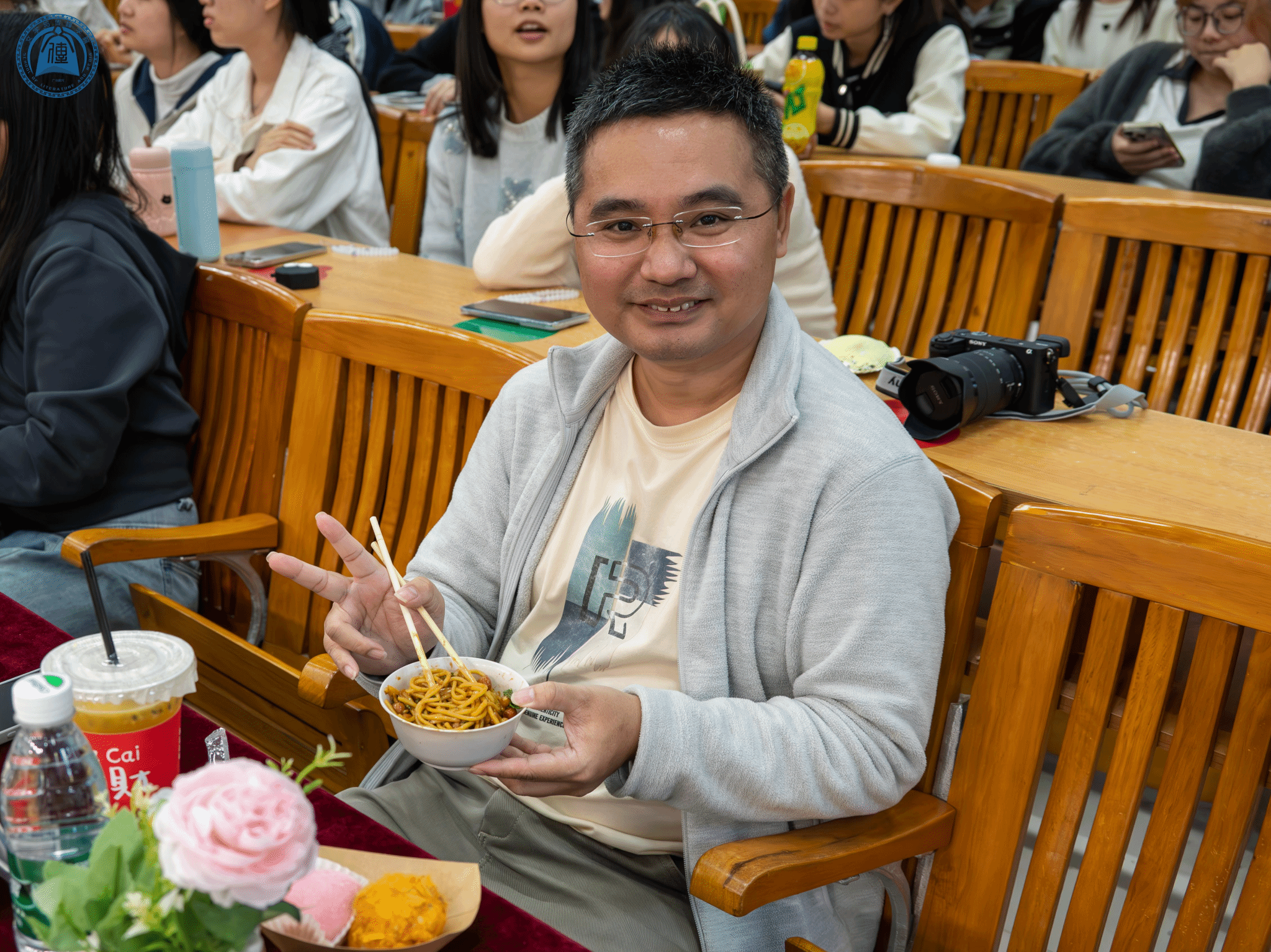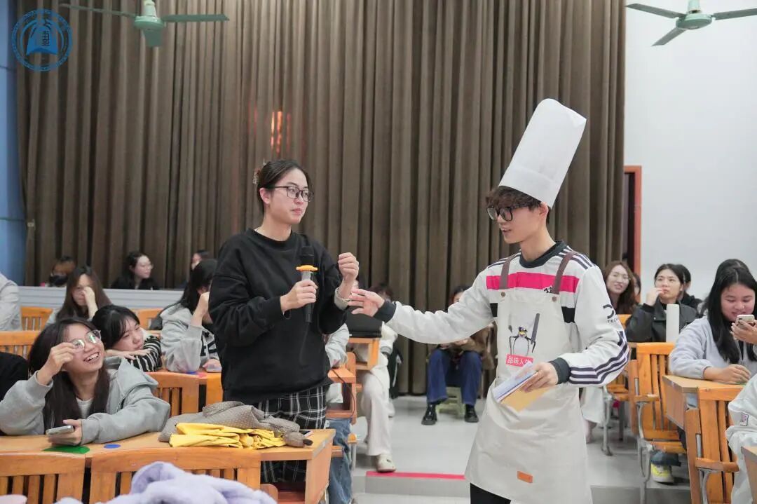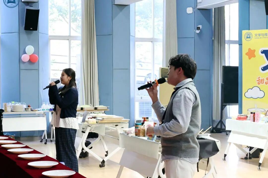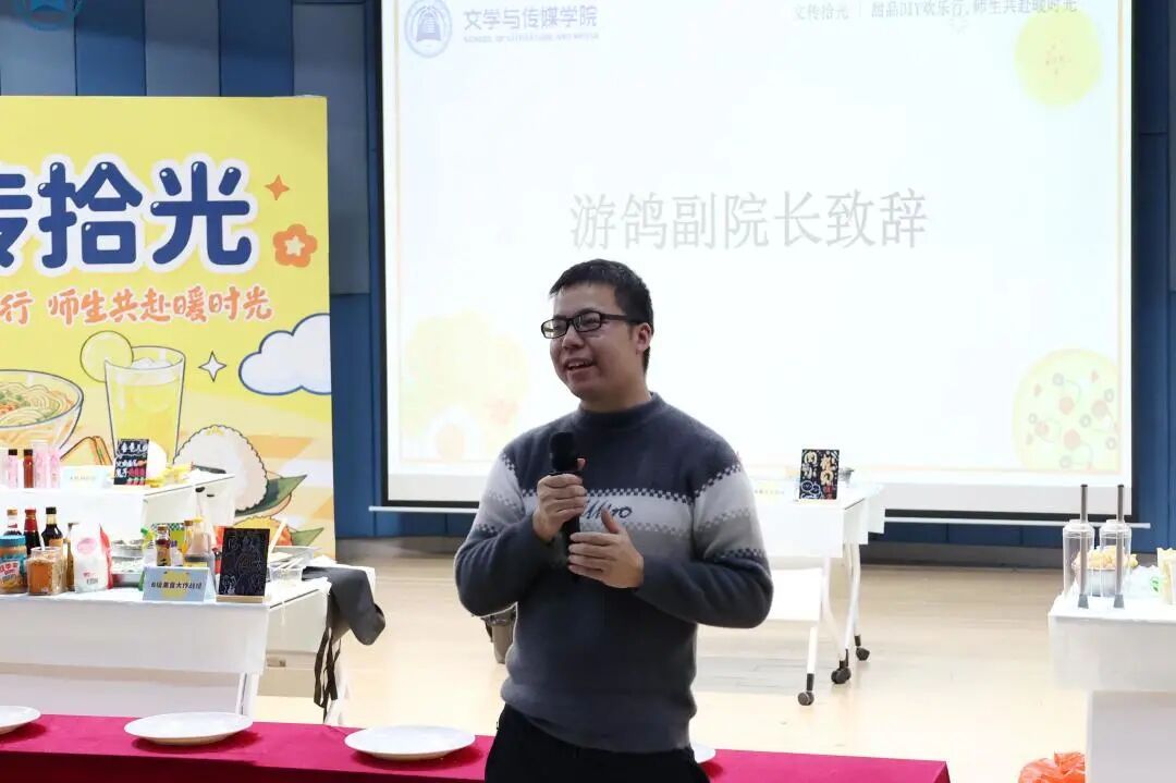 一曲《有点甜》唱罢,现场气氛愈发热烈,游鸽副经理随即上台致辞。他深情回顾了上次包饺子大赛的欢乐时光,表达了对本次美食节的殷切期待与高度认可,鼓励师生们积极参与,在轻松愉悦的互动中增进交流、舒缓压力。