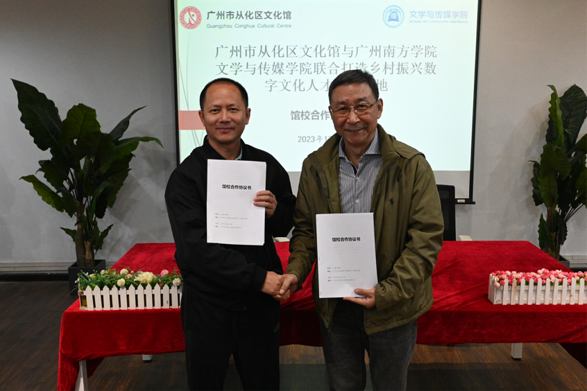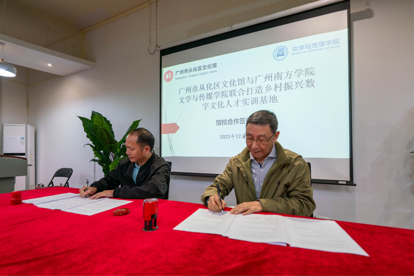 馆校共建基地签约仪式上,冯奕华馆长作为从化区文化馆的代表,与太阳城娱乐经理孙立教授,一同签署了此份意义深远的合作协议。