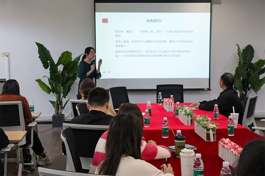 第一节课由温翠艳博士主讲,她详细解读了非遗保护、社区参与和公共文化服务的核心内容和实际操作方法,强调实地考察和深度访谈是做好非遗保护必不可少的步骤。课程中,温老师通过经典案例,向学员展示了访谈前的准备、访谈的方式、访谈后对资料的整理及访谈内容深度思考的重要性。当讲到“口述史访谈”部分时,温老师通过一份员工准备的访谈提问,与学员们进行了深入的交流和互动。在互动环节,学员们纷纷积极发言,分享自己在工作中遇到的访谈经历和做法。温老师对学员们的做法给予了肯定和鼓励,并针对一些具体问题提出建议和指导。