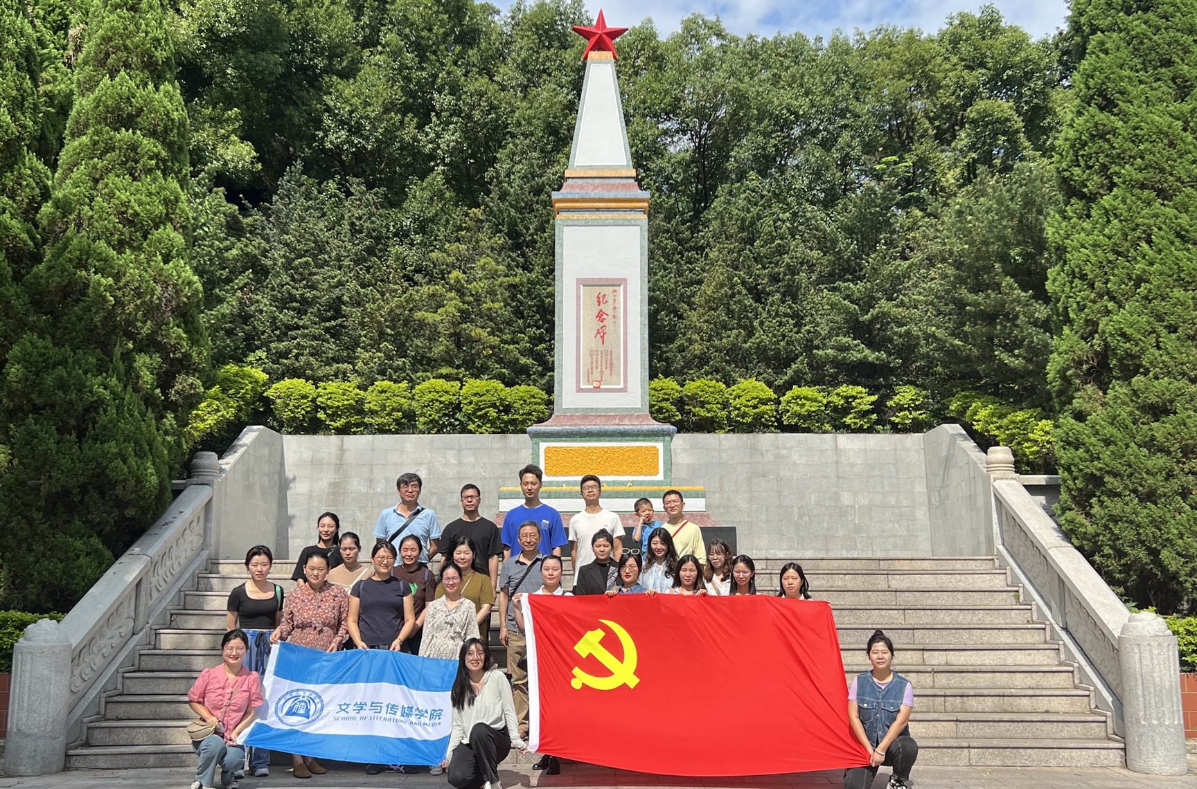 潮州革命烈士纪念碑下,教师党员们聆听潮州革命故事,碑东面刻“永垂不朽”,西面刻“万古长青”。