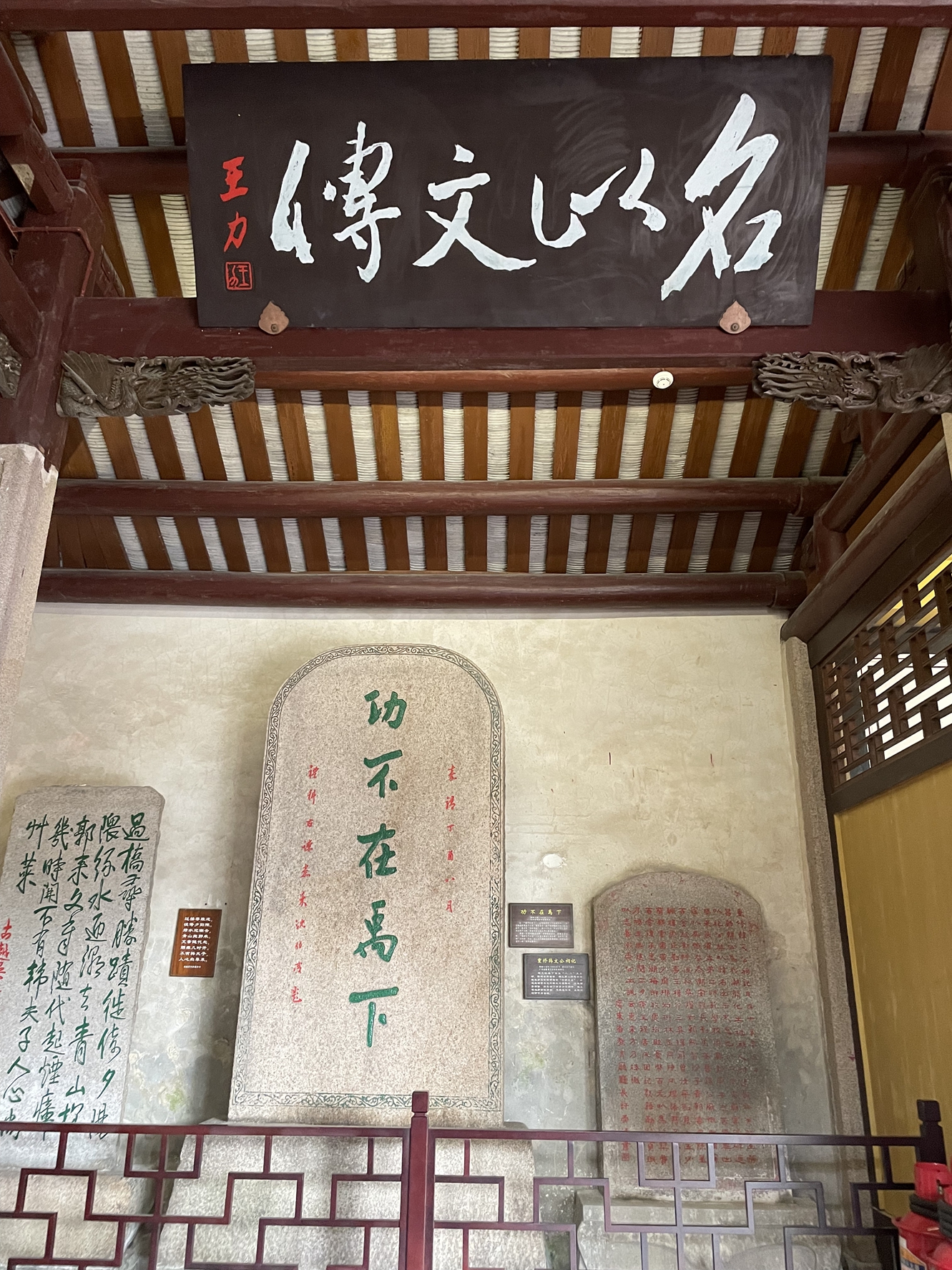 百米碑廊,精选四百幅国家领导人和海内外知名书法家墨宝,勒石雕刻而成,与古祠交相辉映,文气斐然。堂内供韩愈及侍从李万和张千的塑像,四壁上有历代文人名士所留的碑刻40面,皆是写韩愈治潮、韩祠以及歌颂韩愈的诗文。其中,碑刻“功不在禹下”出自韩愈称赞孟子文,后人复以之赞美韩愈。