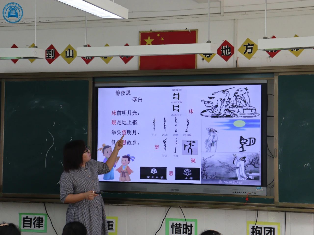 接着周老师从书写工具与承载材料加深了同学们对甲骨文的理解;随后,周老师以同学们非常熟悉的李白的《静夜思》为例,借助甲骨文着重分析了“床”“望”“疑”“思”的意义,引导同学们对这首诗进行了更为透彻地比较合理地理解与欣赏,让同学们充分体会到甲骨文的重要作用;然后周老师又重点阐释了甲骨卜辞以及甲骨文的发现。