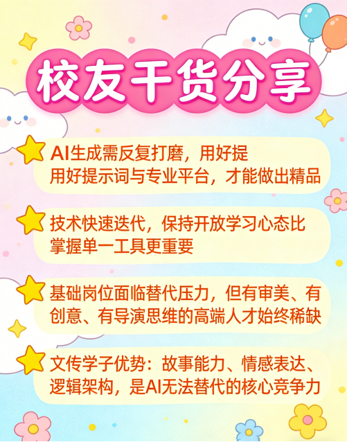 AI 可以生成文字,但替代不了我们对故事逻辑、情感共鸣、人物塑造的把控。作为文传人,我更明确要把文本创作优势与 AI 工具结合,在剧本与内容创作中找到自己的位置。