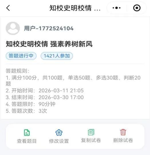 前期线上答题阶段旨在通过全员覆盖的知识检测,巩固前期学习成果。试题形式为单选题、多选题、判断题,系统随机生成100道试题。数字化的形式确保全员参与的便捷性,竞赛机制激发员工主动学习的动力。每一次答题都是一次自我检视,在学习中体悟作为南院人的自豪,在错题中发现认知盲区,实现知识的巩固与深化,完成“知校”的全面检验。